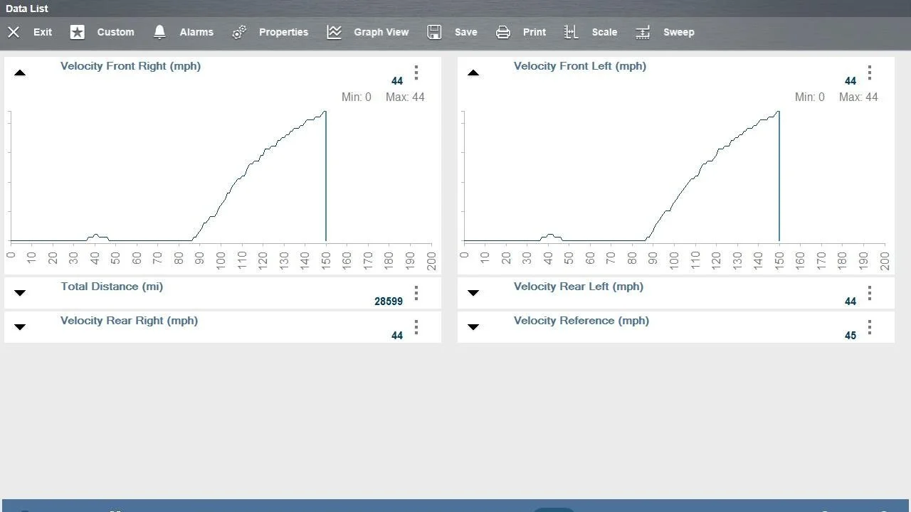 The scan tool I’m using allows me to view each wheel speed sensor to see if they are performing correctly. While viewing the wheel speed sensors, I take a test drive to see which sensors are working and which are not.